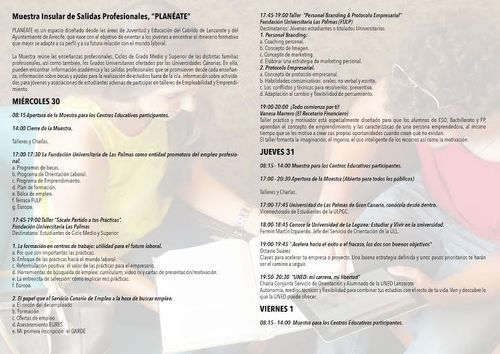 Según explica este lunes en nota de prensa trasladada por el Cabildo a este diario, la consejera de Educación del Cabildo de Lanzarote, Carmen Rosa Márquez, ha manifestado que 'Planéate' “contará con más de 20 stands en los que se ofrecerá información sobre las salidas profesionales de las enseñanzas artísticas y universitarias, y de los ciclos formativos de grado medio y superior, que se ofrecen dentro y fuera de la isla, así como de las becas y ayudas al estudio”. Incluirá además “numerosas charlas y talleres de empleabilidad y emprendimiento”, añadió la consejera.