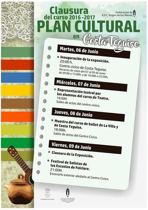 Del 6 al 9 de junio, explica el Gobierno municipal, el Ayuntamiento junto con la Federación han preparado un programa de actos que incluirá sesión teatral, muestra del curso de ballet de La Villa y Costa Teguise y el Festival de Solistas de las Escuelas de Folclore para clausurar la muestra del Plan Cultural, el viernes, a las 21 horas, en el escenario exterior aledaño al Centro Cívico de Costa Teguise.