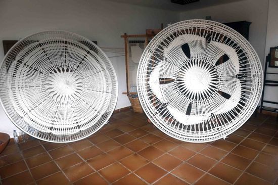 El equipo lleva más de dos meses tejiendo a mano y a ojos de los turistas un total de diez grandes rosetas -5 de 2 metros de diámetro y otras tantas de 3 metros- que servirán para dar cobijo y resguardarse del sol cuando los futuros puestos de artesanía estén montados en el Patio de los Artesanos. Se da la circunstancia, además, de que estas rosetas se convertirán también en elementos decorativos del espacio ya que dibujarán sus formas en el pavimento cuando reciban la luz solar.