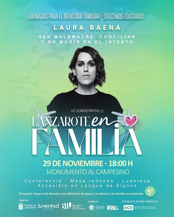 El Cabildo de Lanzarote finalizará el programa “Lanzarote en Familia 2025” el próximo sábado, 29 de noviembre a las 18:00 horas, en el Monumento al Campesino, con la conferencia “Ser malamadre, conciliar y no morir en el intento”, a cargo de Laura Baena, fundadora del Club de Malasmadres y presidenta de la Asociación Yo No Renuncio, considerada uno de los mayores referentes nacionales en conciliación e igualdad.