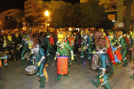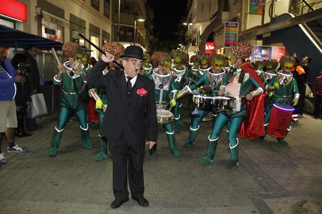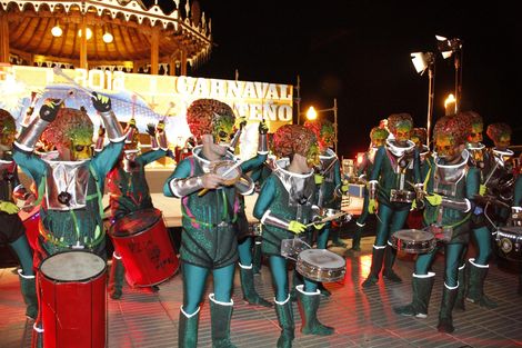 La batucada Villa Pipol fue la encargada de dirigir con su música carnavalera, su ritmo y sus bailes a los numerosos vecinos de la capital que anoche se concentraron en el parque Ramírez Cerdá para disfrutar del inicio de las carnestolendas de la capital. Sus miembros iban disfrazados con una original fantasía de la famosa película de ciencia ficción Mars Attack, ¡Marcianos al Ataque¡, protagonizada por Jack Nicholson, y que curiosamente representaba al futuro frente al pasado de Charlot.