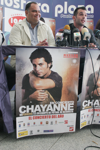 El cantante puertorriqueño Chayanne actuará, por primera vez en Lanzarote, el 8 de febrero de 2008 en el campo de fútbol de Altavista de Arrecife. El esperado concierto tendrá lugar a partir de las 22.30 horas y promete ser un espectáculo único. El pasado jueves tuvo lugar la presentación del evento en el centro comercial de la Bioesfera de Puerto del Carmen. Javier Rolo, representante de Rolo Productions, adelantó durante la rueda de prensa que “el artista combinará los temas de su último disco, Mi tiempo, con los grandes éxitos de su carrera que alcanzaron los primeros puestos de las listas de venta y popularidad, como 'Salomé' o 'Torero', pero fusionados con ritmos más actuales”. También acudieron a la presentación Sandra González, directora general de Ordenación en Canarias, Manolo Cabrera, el consejero de Juventud, y varios concejales de los diferentes ayuntamientos de Lanzarote. “Es un motivo de orgullo que todos los ayuntamientos hayan colaborado y se hayan volcado con la organización del concierto”, aseguró Cabrera. Aunque reconoció que en principio se barajó el nombre del artista Maná, dijo que “que venga Chayanne es todo un lujo y el concierto satisfará las expectativas de todos”.