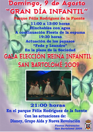 21.00 h.: Gran Gala “Elección Reina Infantil de las Fiestas”, con las actuaciones de: Disney, Grupo Aida y Nueva Revolución, en el parque Félix Rodríguez de la Fuente.