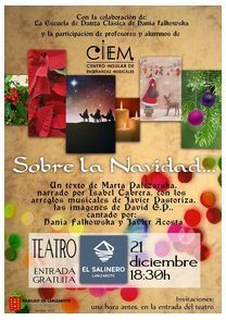 - El miércoles, 21 de diciembre, a las 18:30 horas, también sobre el escenario del Teatro El Salinero, se representará el cuento 'Sobre la Navidad...”. Una obra del CIEM que se desarrollará con la colaboración de la Escuela de Danza Clásica de Hania Falkowska
