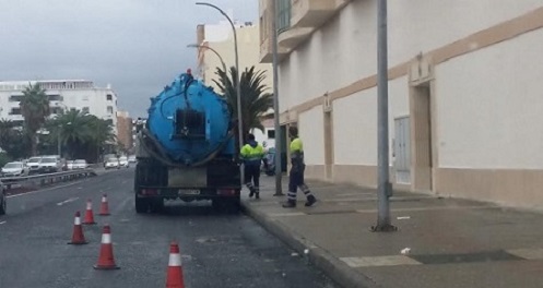 También en Arrecife, los efectivos del Consorcio han tenido que emplearse a fondo en labores de achique de un gran charco que se creó en la calle Vizcaya, donde quedó atrapada una caravana.