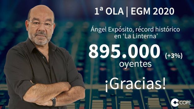 Junto a Herrera, Ángel Expósito se consolida como el otro comunicador en imparable crecimiento. ‘La Linterna’, de lunes a viernes a las 19.00 horas, gana 23.000 oyentes en el primer trimestre de 2020, un 3%, que sitúa el programa en su récord histórico de audiencia: 895.000 diarios. La Brújula, de Onda Cero, pierde 20.000.
