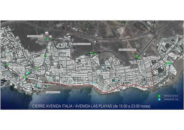 Los accesos al tráfico de vehículos, así como las paradas de guaguas y taxi se verán afectados debido a la celebración del Gran Coso Carnavalero de Puerto del Carmen el sábado 29 desde las 15 horas hasta las 23:00 horas. En los planos pueden verse los cortes más importantes y las ubicaciones de las paradas de los transportes públicos.