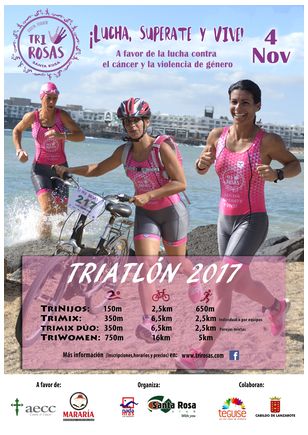 Bajo este lema, el triatlón TriRosas, organizado por Club Nadamás y Santa Rosa, ofrece 4 modalidades distintas para todos los públicos: el TriNijos (150 m de natación, 2,5 km en bici y 650 m corriendo), el TriMix (350 m/6,5 km/2,5 km, individual o por equipos), TriMix Dúo (mismas distancias pero en parejas mixtas), y el TriWomen, la prueba grande (750 m/16 km/5 km). Todas ellas se desarrollarán el 4 de noviembre por la avenida de Costa Teguise y parte de Los Ancones, con recorrido interior por Costa Teguise en la prueba de bicicleta de montaña; así como la caminata TriLadies, de 2,5 km.