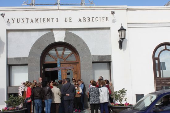 También la alcaldesa de Arrecife Eva de Anta y parte de la Corporación municipal dieron la bienvenida este miércoles por la mañana a la Cruz de Lampedusa, representación del dolor de miles de refugiados que ponen en riesgo sus vidas, perdiéndolas en muchos casos, al intentar cruzar el Mediterráneo en frágiles embarcaciones para llegar hasta las costas europeas.