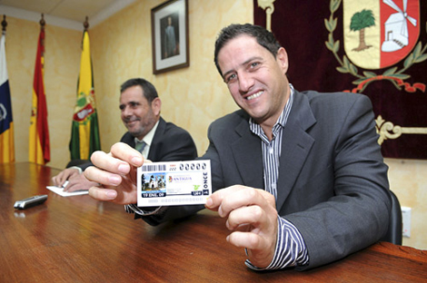 El alcalde de Antigua, Gustavo Berriel, muestra el cupón de la ONCE en el que aparecerá la fachada de la iglesia de la localidad.