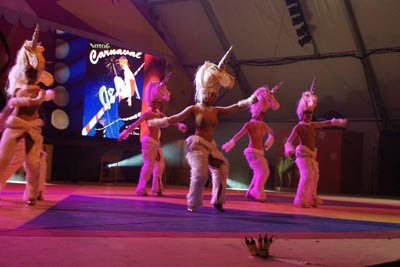 Conducida por la drag Kimba Ébola, que estuvo acompañada en el escenario por Manu Llanes, la animación de la gala correspondió al ballet grancanario Collage. Performances y transformistas ofrecieron también todo un espectáculo en una noche marcada por el exceso, del que por otro lado hicieron gala “Las Nancy Rubias”, que pusieron la nota musical a la noche. El ballet conejero Liberty Dance demostró arte e ingenio ante el numeroso y animado público que se dio en el Recinto Ferial.