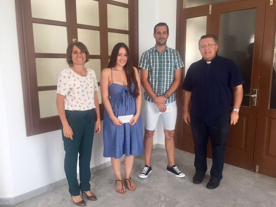 La alcaldesa de Arrecife, Eva de Anta, y el párroco de la Iglesia de San Ginés, Miguel Hernández, hicieron entrega este jueves por la mañana a los estudiantes Antonio Betancourt y Alejandra Villarejos de la beca al estudio Luis Ramírez.