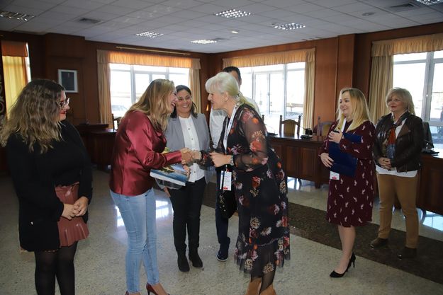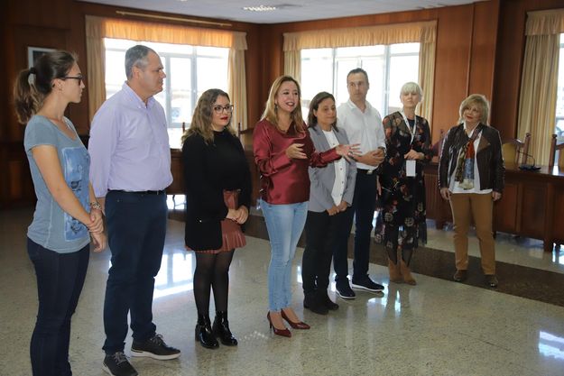 La presidenta del Cabildo de Lanzarote, María Dolores Corujo, junto a los consejeros de Educación y Geoparque Lanzarote, Paula Corujo y Hugo Delgado, respectivamente, recibió este lunes a los estudiantes que participan en el proyecto Erasmus + "OD BARTERU DO BITCOINA - HANDEL KOEM SI TOCZY " ("Del trueque al bitcoin").
