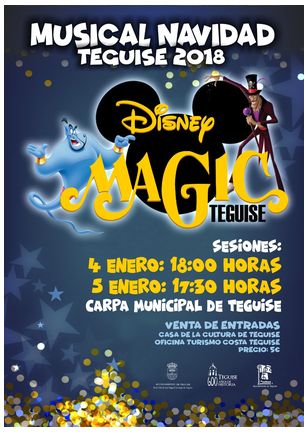 Los amantes del universo Disney tienen esta Navidad una nueva cita en La Villa de Teguise. El jueves 4 de enero, a las 18 horas, y el viernes 5, a las 17.30 horas, la magia de la factoría Disney inundará el escenario de la Carpa Municipal, por el que desfilarán distintos personajes representados por treinta cantantes y bailarines, coordinados por Sergio Niz (coreografía e interpretación) y Gisela González (canto).