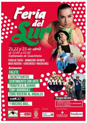Organizada por la Asociación Al-Andalus entre Alisios y Levante y Chavaud Producciones, y con la colaboración del Ayuntamiento de San Bartolomé, la Feria del Sur arrancará el 21 de abril a las 21:00 horas y acabará el 23 de abril a las 20:00 horas. Se celebrará en la Explanada de Guacimeta y contará con actuaciones variadas que subirán al escenario a Tributo a “El Barrio”, Sentimiento con arte, el cómico Tony Rodríguez, Coro Rociero Al-Andalus, TreintyTantos, Marcet Dejjay & Speaker, y Falete.