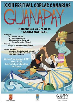 Asimismo, y como es habitual, explican este viernes en nota de prensa desde la Concejalía de Cultura del Ayuntamiento de Teguise, durante el Festival se darán a conocer los ganadores del Concurso de Coplas Canarias Guanapay, convocado por el área de Cultura del Ayuntamiento de Teguise y en el que participan cada año los amantes del folclore y la literatura, y con el que se pretende rescatar el arte de los coplistas y las costumbres de Canarias.