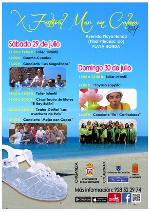 Así, los días 29 de julio y 30 de julio, en la Avenida de Playa Honda, (al final de la Calle Princesa Ico), tendrá lugar la décima edición del Mar en Calma. Un encuentro musical y teatral que se consolida como el festival estival del municipio. Se sucederán actuaciones centradas en dos jornadas, el sábado, 29 de julio, los niños y niñas contarán con una atractiva programación desde las 11 horas, que abarca talleres en diferentes horarios en los que realizarán manualidades de confección de llaveros con cholitas de playa, creación de barquitos de foam y goma eva y pulseras de hilos de colores, también contarán con sesión de cuentacuentos, y dos espectáculos infantiles El Rey Bufón y Las aventuras de Rufo, y para todos los públicos concierto de Los Magnéticos y Mejor con copas, que a partir de las 21.00 horas cerrará con su actuación la velada.