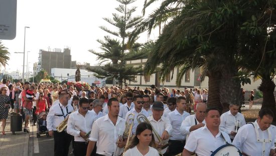 La Virgen del Carmen llegó hasta el Hospital Insular desde la Iglesia, desde allí encabezada por la Banda de Música y los vecinos y vecinas, la acompañaron hasta el muelle donde fue embarcada.