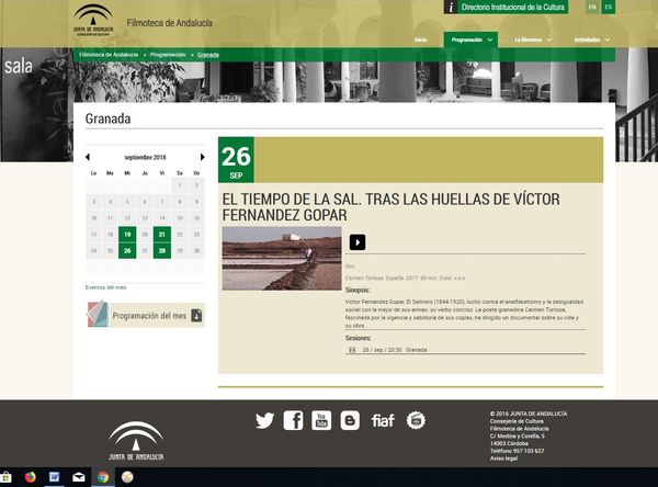 La Filmoteca de Andalucía ha anunciado este mes de septiembre la proyección de El Tiempo de la Sal. Tras las huellas de Víctor Fernández Gopar, film poético dirigido por la escritora y cineasta Carmen Tortosa que recoge en 60 minutos la trayectoria de ‘El Salinero’. El documental está programado para las 20:30 horas del día miércoles 26 de septiembre, en la sala Val de Omar de la ciudad de Granada, donde también está previsto un coloquio participado por la directora y miembros del equipo de producción.