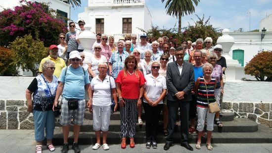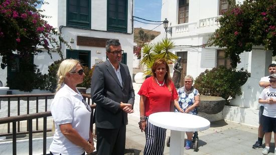 El alcalde de Haría, Marci Acuña, y la concejala de Turismo, Soraya Brito, recibieron este miércoles al grupo de cerca de medio centenar de turistas noruegos que inauguraba la nueva ruta histórica por el pueblo de Haría, merced al acuerdo de colaboración suscrito entre el Ayuntamiento norteño y los touroperadores Vital Reiser y Tui.