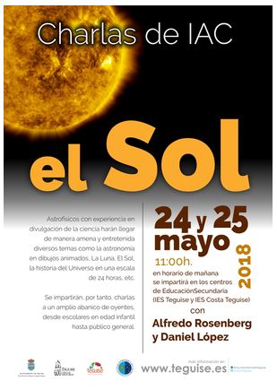 Asimismo, los alumnos del IES Teguise e IES Costa Teguise recibirán sendas charlas sobre el Sol de la mano de Alfredo Rosenberg y Daniel López (IAC), este jueves 24 y viernes 25, a las 11 horas en sus respectivos.