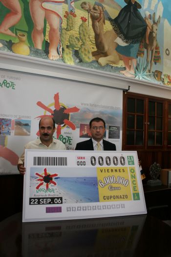 El consejero del Patronato de Turismo, Miguel Ángel Leal, y el director insular de la Organización Nacional de Ciegos de España, Manuel Ventura,presentaron en la mañana de este miércoles la imagen del próximo cúpón de la ONCE, boleto que está dotado con 6.000.000 de euros y que mostrará la imagen de playas de Papagayo junto al anagrama de Reserva de la Biosfera.