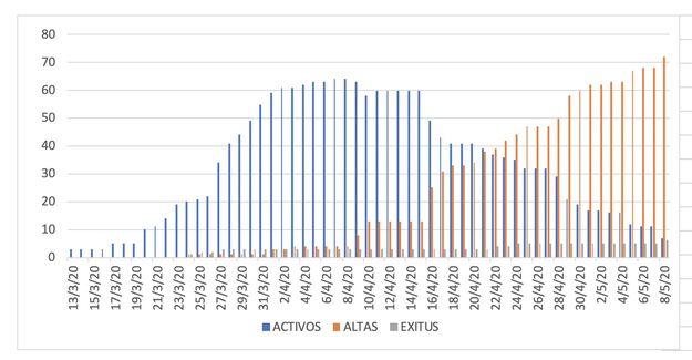 A días de hoy hay 7 casos activos de los 85 totales que se han producido desde que se detectó el coronavirus y sólo 5 permanecen ingresadas en el Doctor José Molina Orosa (2 en la Unidad de Medicina Intensiva y 3 en planta).