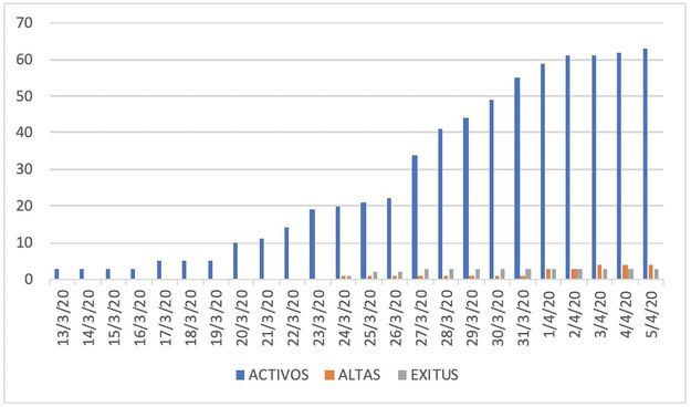 El total de casos confirmados que están activos en estos momentos es de 63. De ellos, 17 están ingresados en el Hospital, 8 en planta y 9 en la Unidad de Medicina Intensiva (UMI). En seguimiento en sus domicilios a través de la atención primaria hay 46 casos. En esta jornada se han realizado 8 muestras de posibles positivos, cuyos resultados se conocerán por tanto el martes.