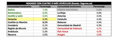Según un estudio elaborado por el comparador de seguros online independiente Seguros.es, en España hay 655.000 hogares que cuentan con al menos cuatro coches, con Galicia al frente de la clasificación autonómica y Aragón al otro extremo. Canarias ocupa la cuarta posición en el ranking nacional.
