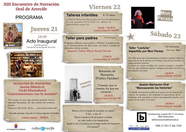 Las “Conversaciones con la muerte” del músico Aarón y la narradora Vicky abrirán los XIII Encuentros de Narración oral de Arrecife, el 21 de marzo a las 20 horas en la Casa de la Cultura “Agustín de la Hoz”, abiertos al público adulto.