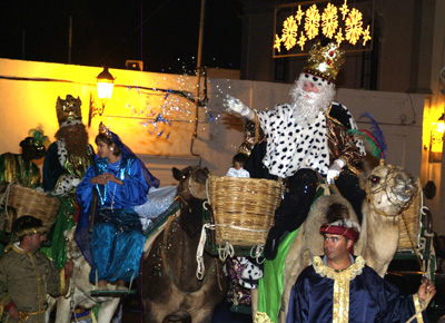 El pueblo turístico de Costa Teguise recibió a los tres Reyes a las 18.30 horas de la tarde en el Muelle y recorrieron algunas de las calles más céntricas hasta llegar al Pueblo Marinero, en donde Melchor, Gaspar y Baltasar entregaron numerosos regalos y juguetes a los niños y niñas. Partieron después hacia La Villa para comenzar su andadura en camello a las 21.15 horas de la noche, desde el Convento de Santo Domingo hasta la Plaza.