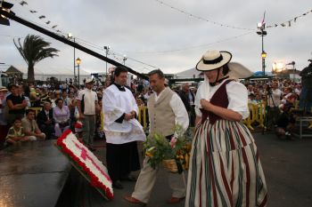 Una hilera de carros, caballos y agrupaciones folclóricas como Los Buches, así como de romeros ataviados con el traje típico en su mayoría, se divisaba a lo largo de la calle, esperando pacientemente a que llegase su turno para ofrecer las viandas a la patrona. El momento de las ofrendas se alargó hasta las 22.00 horas, momento en que la Virgen de los Dolores regresó a la ermita y se dio paso al Baile del Romero, donde actuaron hasta altas horas de la madrugada los grupos “Los paperos”, “Timbayba”, “Afu”, “Amigos de la parranda” y la “Agrupación Folclórica Los Campitos”.