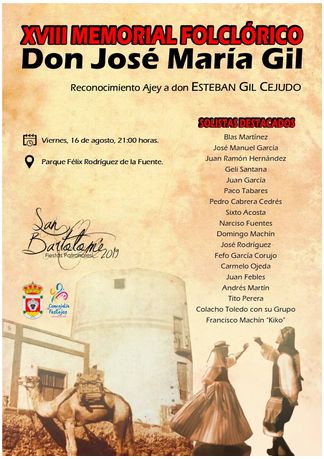 A las 21:00 horas dará comienzo el XVIII Memorial Folclórico Don José María Gil, con la actuación de la Agrupación Folclórica Guadarfía, acompañada de solistas destacados en el Parque Félix Rodríguez de la Fuente. En el transcurso del acto se entregará el Premio Ajey a la labor Folclórica a Don Esteban Gil.