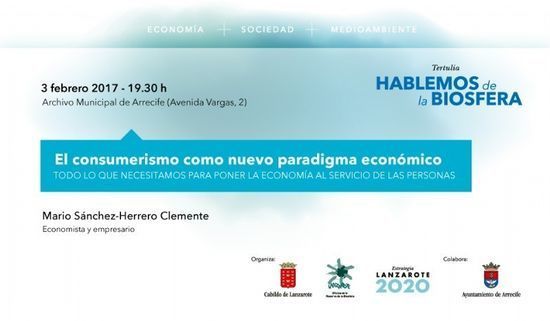 'El consumerismo como nuevo paradigma económico. Todo lo que necesitamos para poner la economía al servicio de las personas', es la nueva charla que organiza la Reserva de la Biosfera que dirige el presidente del Cabildo de Lanzarote, Pedro San Ginés, en el marco de las tertulias 'Hablemos de la Biosfera', una iniciativa que se viene desarrollando todos los meses desde el pasado año. Esta charla cuenta con la colaboración del Ayuntamiento de Arrecife.