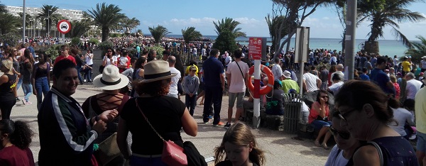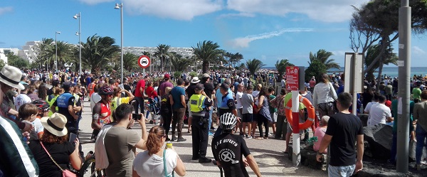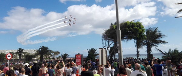 Miles de personas han llenado este domingo las calles de Costa Teguise para acudir a la cita que el Ayuntamiento y el Ejército habían organizado en la playa de Las Cucharas. La idea era ver la exhibición que los integrantes de la Patrulla Águila tenían preparada para un día soleado que se inició con lluvia y que finalmente se convirtió en todo un éxito.