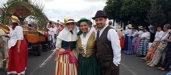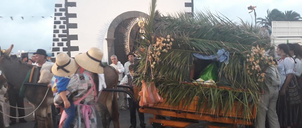 A la sombra de cualquier zoco, palmera o higuera aprovechan la ocasión para descansar, echarse unos enyesques con un buen trago de vino de la tierra y afinar sus gargantas; sobre las cuatro de la tarde en las proximidades de la Iglesia de San Roque, parte la romería con sus carros tirados por burros y camellos, al ritmo de los variados instrumentos tradicionales, entremezclándose con cantares populares y gritos de los más chinijos en una explosión de alegría y participación, para alcanzar sobre las nueve de la noche la ermita de Mancha Blanca, donde nos encontramos con la Virgen, donde los feligreses se encuentran con la virgen dejando a sus pies las humildes ofrendas que con tanto cariño han llevado.