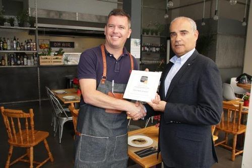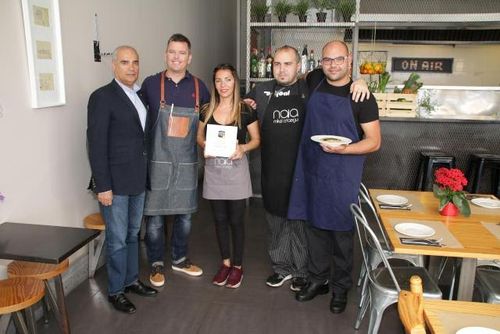 El concejal de Turismo y Cultura del Ayuntamiento de Arrecife, Rafael Juan González Robayna, entregó este jueves por la mañana los responsables de los restaurantes “La Bulla” y “Naia-Mikel Otaegui”, la placa que acredita que sus tapas “Mini burguer de buey” y “Arroz cremoso de setas” son las que más han gustado a los usuarios de la App “Tapas en Arrecife” en las temporadas de verano y otoño 2015, respectivamente.