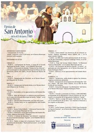 Durante estos días y hasta el próximo 13 de junio la localidad de Tías celebra sus fiestas populares en honor a San Antonio con un completo programa de actos organizado por la Comisión de Fiestas “San Antonio 2016” en colaboración con el Ayuntamiento de Tías.
