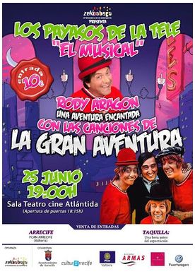 El programa de actividades de Cultura Arrecife pondrá su broche de oro el próximo día 25 de junio con el musical “Los Payasos de la Tele”, una aventura de Rody Aragón con las canciones de “La Gran Aventura”. Será a las 19:00 horas en la Sala Teatro del Cine Atlántida.