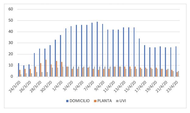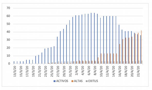 También ha bajado el número de pacientes ingresados a 9 en total, de los que 4 permanecen en planta y 5 en la UMI (Unidad de Medicina Intensiva) y el de personas en seguimiento domiciliario, que en este momento son 27.
