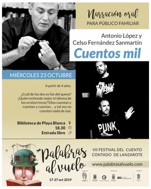 El Ayuntamiento de Yaiza, un año más como entidad colaboradora del Festival Palabras al Vuelo, el Festival del Cuento Contado de Lanzarote, invita a vecinos y vecinas del municipio a disfrutar de dos funciones gratuitas de narración oral previstas para esta semana. La primera cita, ‘Cuentos mil’, este miércoles 23 de octubre en la Biblioteca de Playa Blanca a las 18:30 horas, es una propuesta escénica dirigida a público familiar y niños a partir de cuatro años donde los narradores Antonio López y Celso Fernández quizá cuenten ¿Cuál de los dos es fan del queso? o ¿Quién entiende mejor el idioma de los ornitorrincos? O incluso tal vez no cuenten nada de eso. Lo mejor será comprobarlo.