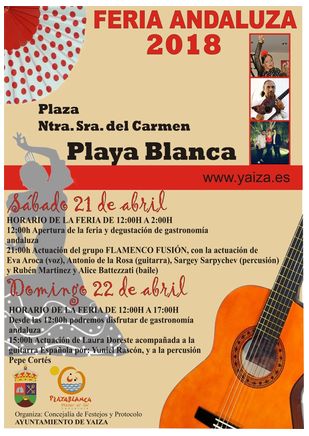 El Gobierno municipal explica en nota informativa que el sábado 21 sube a tarima, a las 21:00 horas, el grupo Flamenco Fusión con la actuación de la cantante Eva Aroca, Antonio de la Rosa (guitarra), Sargey Sarpychev (percusión) y Rubén Martínez y Alice Battezzati (baile). La fiesta en todo caso comienza el sábado a partir de las 12:00 horas del medio día, horario de apertura que se mantiene para el domingo 22 de abril. Este último día actúa, a las 15:00 horas, Laura Doreste, acompañada en la guitarra española por Yuniel Rascón y Pepe Corté en la percusión. El concejal de Festejos de Yaiza, Javier Camacho, anima a la participación.