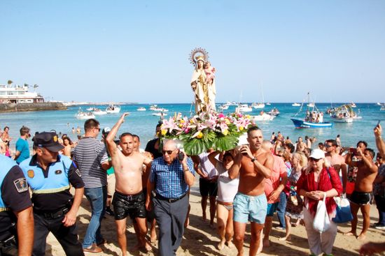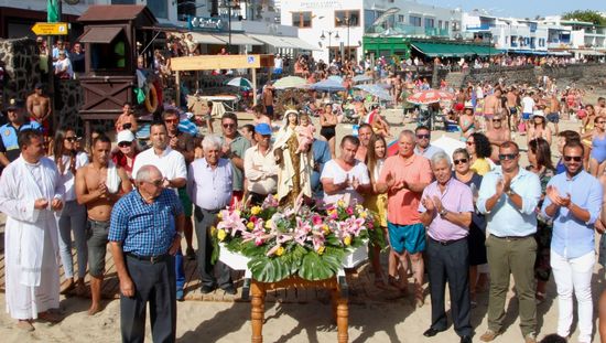 Una misa de corta duración presidida por el cura de Yaiza, Sixto Álvarez, precedió la bajada de la patrona de la iglesia a la playa mientras cantaba y tocaba la parranda Pal’ Porrón. Tras 14 años de servicio a la comunidad cristina sureña, Álvarez deja la Parroquia de Yaiza para continuar su misión en otro destino, así, la de 2018 fue su última procesión marítima como párroco en este periodo de trabajo en Yaiza.