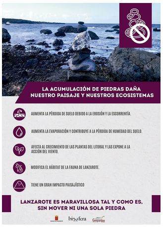 El consejero de la Reserva de la Biosfera, Rafael Juan González Robayna, detalló algunas de las afecciones que tiene sobre el paisaje esta acción de acumular piedras formando estas aparentemente inofensivas figuras, lo que provoca “el aumento de la pérdida de suelo debido a la erosión y la escorrentía; el aumento de la evaporación y por consiguiente la pérdida de humedad del suelo; afecta también al crecimiento de las plantas del litoral y las expone a la acción del viento; modifica el hábitat de la fauna de Lanzarote; y -en general- tiene un gran impacto paisajístico”.