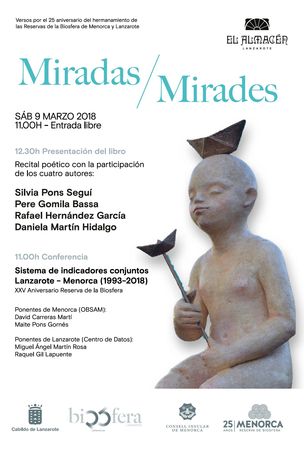 A continuación, a las 12:30 horas, se llevará a cabo el recital poético y presentación en la isla de Lanzarote del libro 'Miradas/Mirades' de los poetas Daniela Martín y Rafael Hernández de Lanzarote y Silvia Pons y Pere Gomila de Menorca. Estos cuatro poetas comparten su mirada y el sentimiento poético evocado en ellos tras una visita a la isla hermana. Los poetas de Lanzarote relatan así con extraordinaria sensibilidad su “mirada” sobre la isla de Menorca en una quincena de poemas y textos breves, editados en castellano y catalán, que reflejan una realidad distinta y a su vez muy similar a la que conocen muy de cerca, y viceversa. En total, el libro recoge unos 28 poemas.