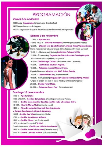 En un solo espacio hoteles, wedding planners, stand de Centros de Arte, Cultura y Turismo del Cabildo de Lanzarote y espacios privados que acogen celebraciones, restaurantes y catering, empresas de moda, fotógrafos, djs, empresas de belleza, papelería, pastelería, agencias de viajes, detalles, regalos, complementos y joyería se darán cita para mostrar sus servicios. La Feria contará con ludoteca infantil para facilitar a las familias la visita a las instalaciones, mientras los/as más pequeños de la casa disfrutan jugando.