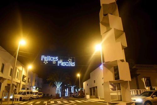 Las luces navideñas, explica este lunes el Ayuntamiento en nota de prensa, se han instalado principalmente en las palmeras de las entradas de los distintos pueblos y entradas de cada una de las localidades o calle principal con guirnaldas de microlámparas de led.