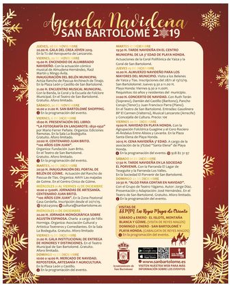 Además se inaugurará el Portal de Belén de Güime con actuación del Rancho de Pascua de Tías, tendrá lugar una Jornada Monográfica sobre Agustín Espinosa con charla a cargo de Félix Hormiga, Gala Institucional de Entrega de Honores y Distinciones de San Bartolomé y Mercado de Navidad, con repostería, artesanía y productos de la tierra.