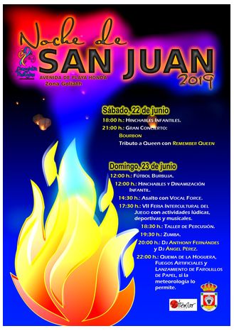 Los actos del día 22 de junio corren a cargo de la Concejalía de Festejos contando con una noche en la que la música será la gran protagonista dando comienzo la velada con los lanzaroteños Bourbon seguido del Gran Concierto Tributo “Remember Queen” y los actos del día 23 de junio se realizan conjuntamente entre el Ayuntamiento de San Bartolomé y el ICI, con una amplia programación para promover la diversidad, relaciones, espacios de encuentro y juegos, enmarcado todo dentro de la VII Feria Intercultural del Juego San Juan (Proceso Comunitario de San Bartolomé). Todos los actos se celebrarán en la Avenida de Playa Honda zona Goliath.
