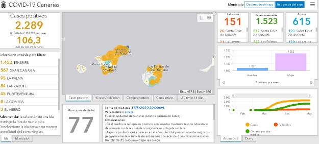 Según ha confirmado la Consejería de Sanidad en su balance de la tarde y tras la actualización que hace de los números a última hora del día, las Islas tienen en estos momentos 2.289 casos de personas contagiadas y 151 muertos por la acción directa de la enfermedad. El número de altas queda en 1.523 personas. De momento quedan 615 casos activos.
